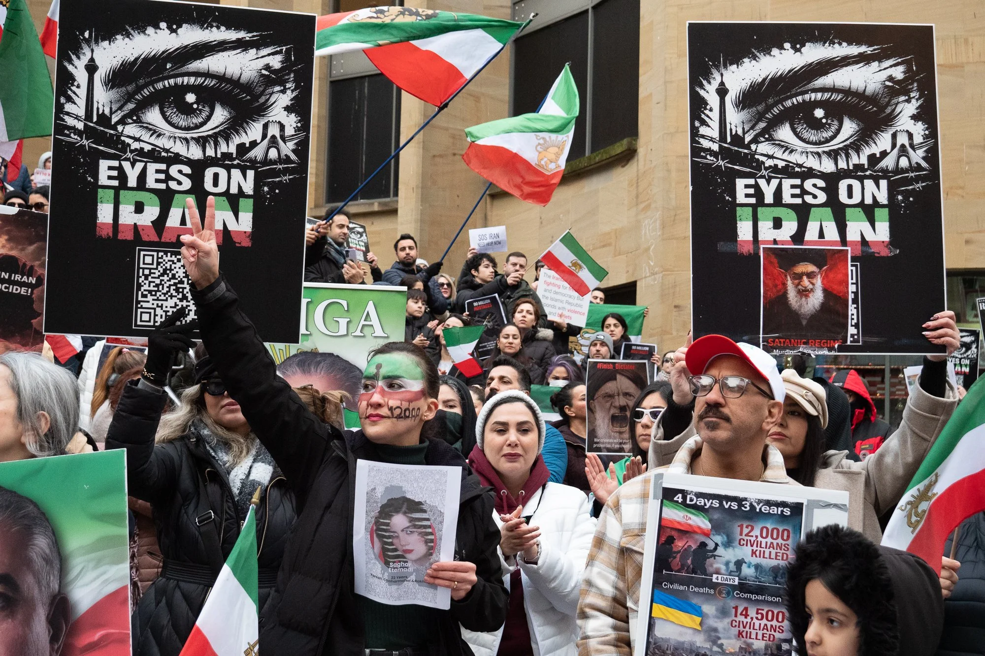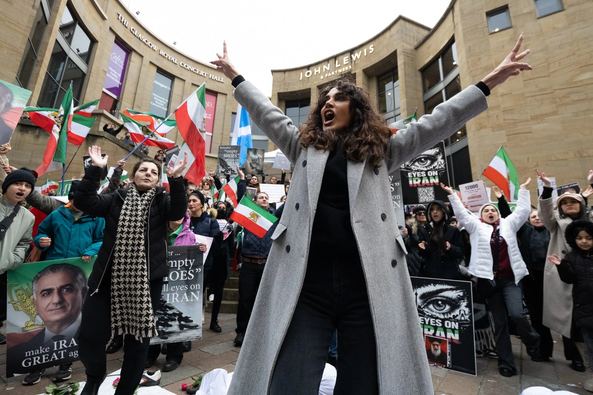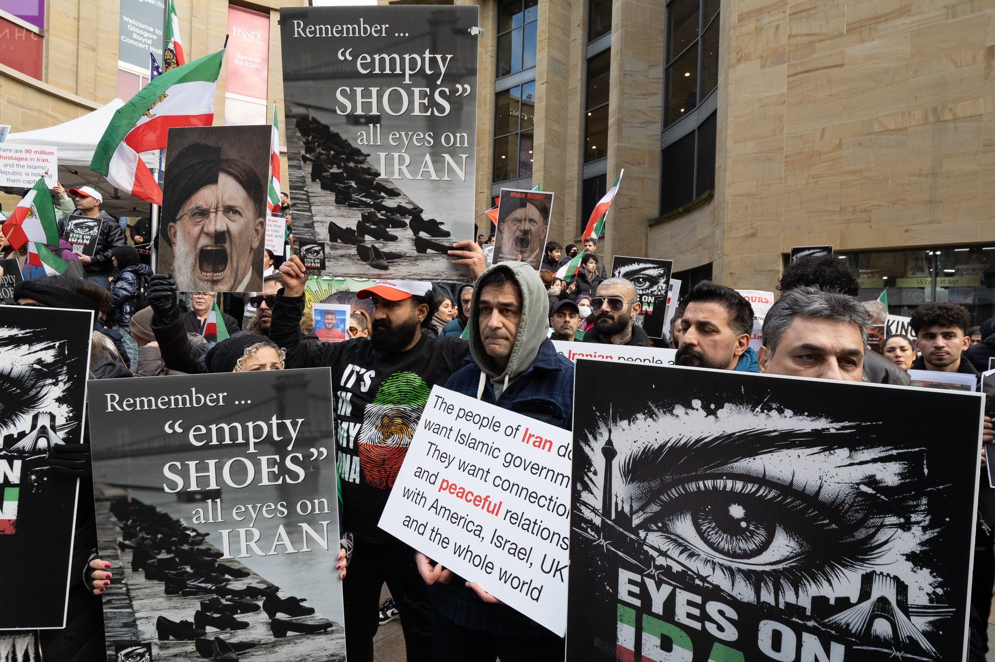 Scotland, home to a large Iranian community, inevitably saw those sentiments reflected locally. The first protest I attended was in Edinburgh, outside the US consulate, followed by one in Glasgow days later. The atmosphere at both was electric: protesters packed tightly beneath a sea of banners and flags, perfect for my favoured wide-angle lens.