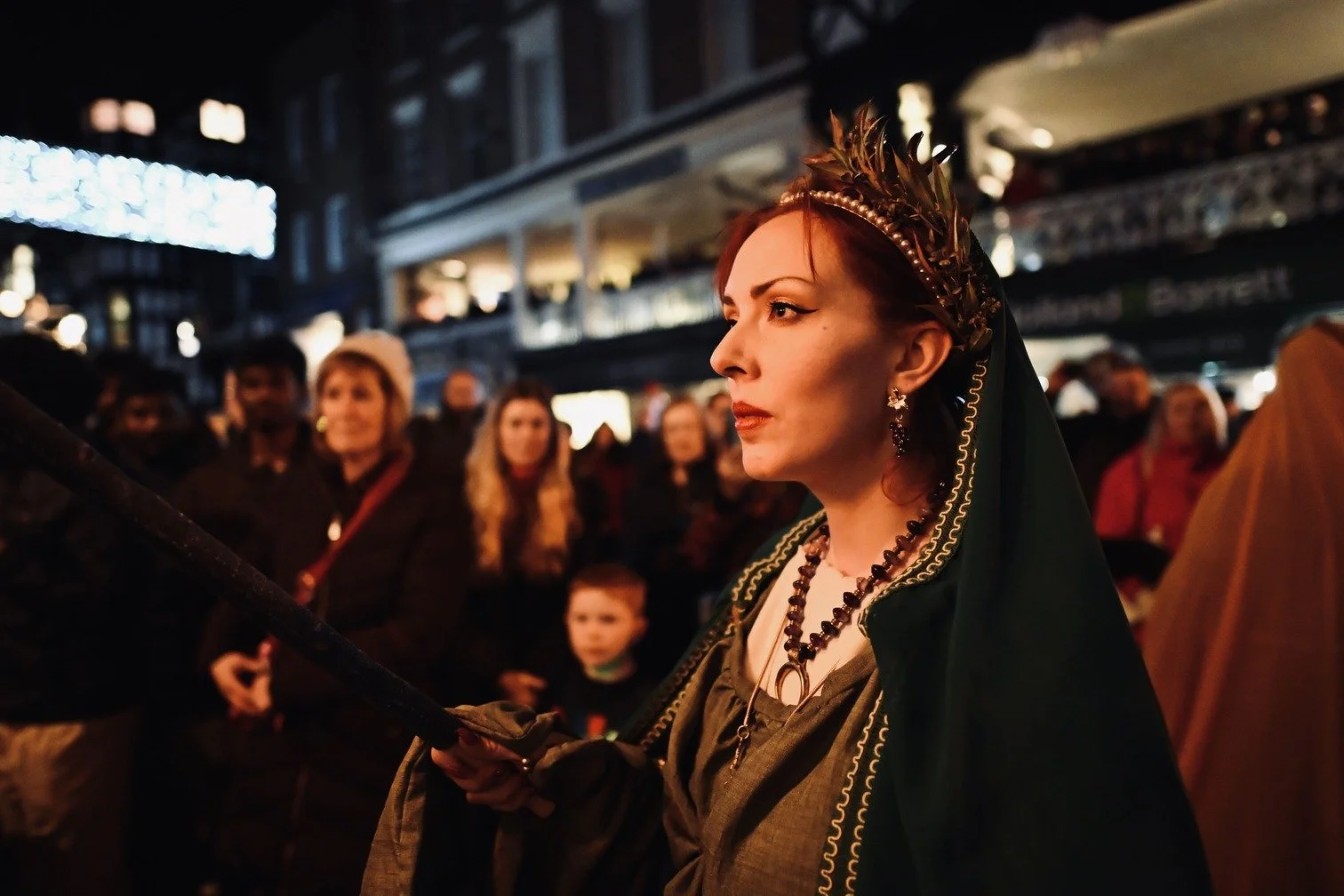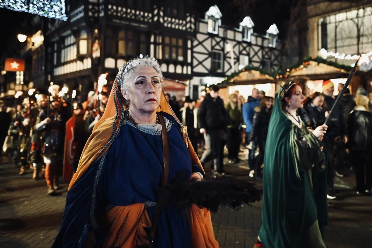 I’d expected a good turnout on the night but hadn’t realised how many photographers would be jostling for the same vantage points, this is a popular event. Fortunately, despite the streets being fairly dark, not many flash guns were going off, so the scenes retained some of the visual warmth and cosiness you’d associate with Christmas celebrations. Two thousand years ago “Io Saturnalia” would have been a common cry throughout Europe but this December night in 2025 it was just for those lucky enough to be in Chester.