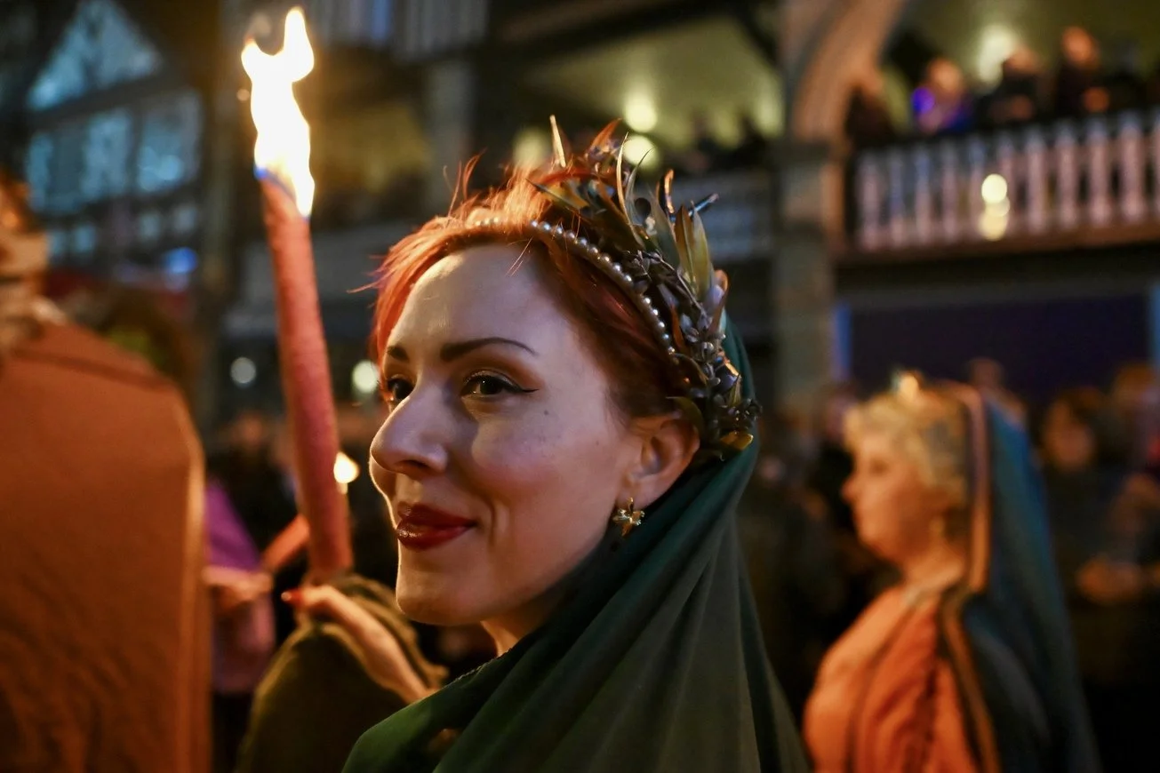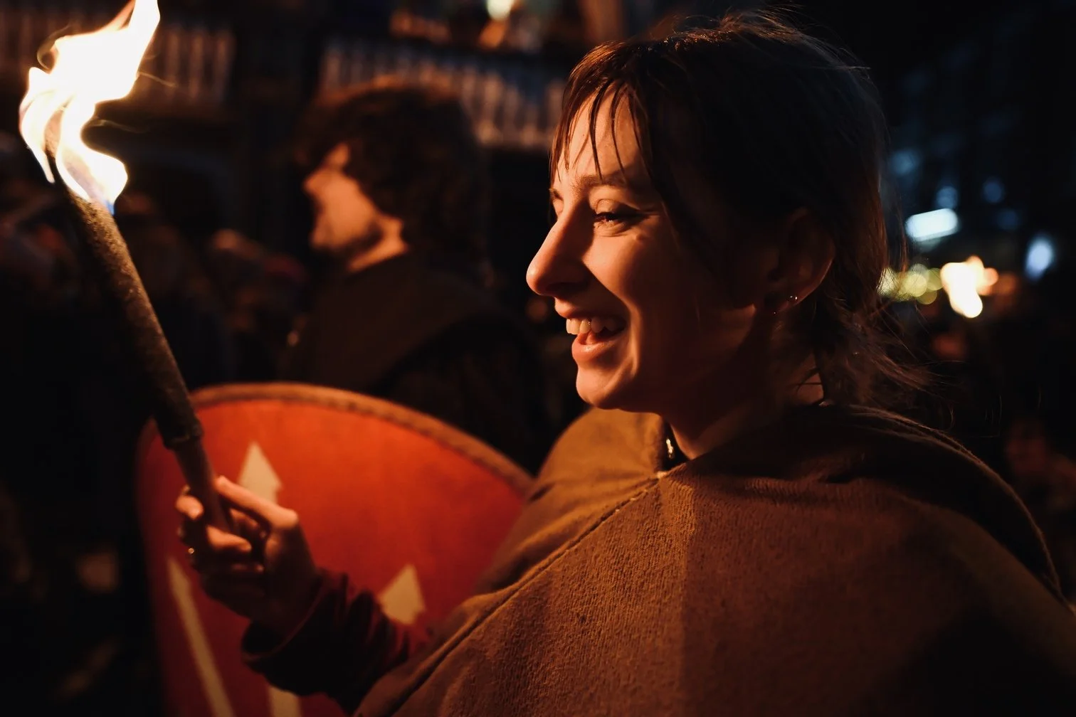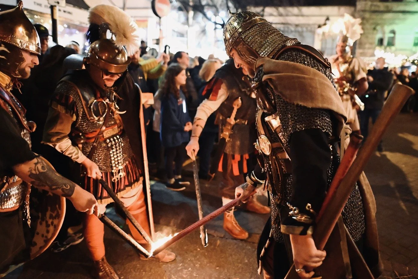 Speeches over, torches were lit and four of the legionaries stood facing the Cardinal points before sharing their light, which symbolised keeping the cold and hunger of the dark winter at bay. They were then ordered to form orderly lines and head two abreast through the streets. The shouting of the marching troops drew more attention and the crowds grew as we made our way around the city but being so vocal took its toll, especially on the cracked voices of those barking out the orders. In addition to everything being well orchestrated, this fun history lesson was imparted in a humorous way and there was a very good rapport between the re-enactors and crowd.