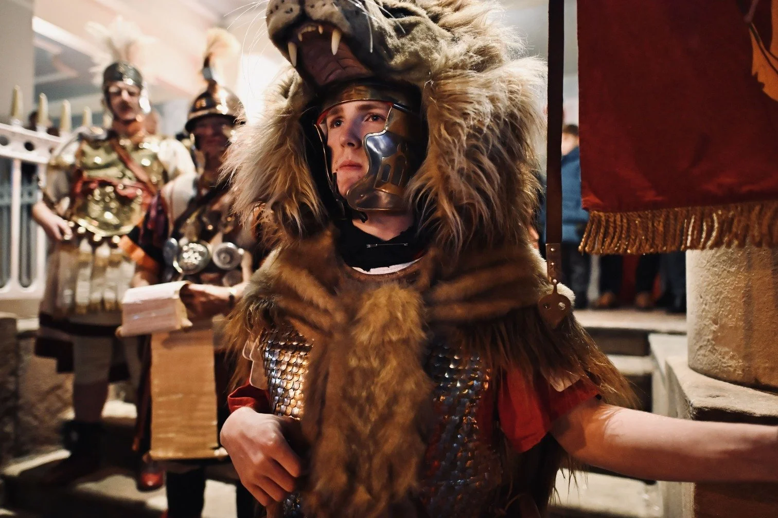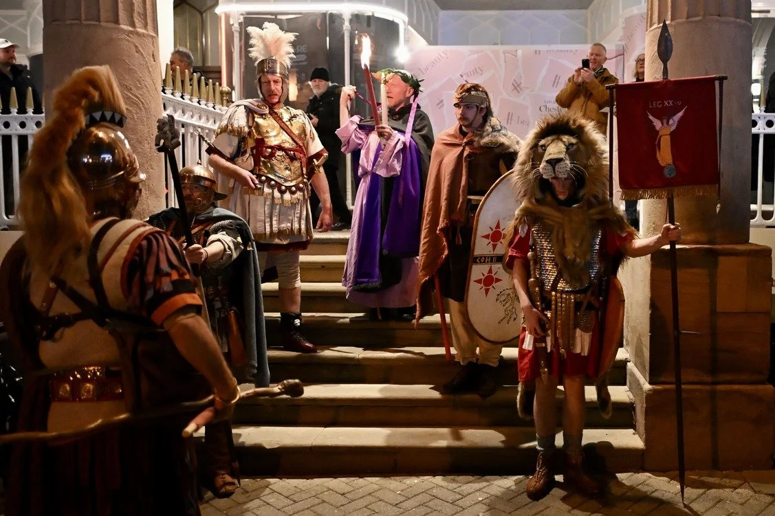 Ordinarily I’d have headed straight for the town hall but this time, in order to catch up with the re-enactors, the meeting point was near the office of the Roman Tours by the Grosvenor Museum. It had taken longer than planned to drive to Chester and, fearing I’d be late, I just needed to figure out which street to head for. There was no need to worry though, because as I negotiated the busy traffic at the roundabout I heard a familiar cry ring out: “Io Saturnalia!” I followed my ears and - having said some hellos - set off with the resplendent looking troops and honourable ladies through the busy streets of Chester. An Emperor dressed in robes with a crown of laurel leaf may not be an everyday occurrence, but the sight of a standard bearer with his head in a lion’s mouth must certainly have caught one or two drivers by surprise, especially when they heard that repeated cry which is actually pronounced "Yo Saturnalia" and was the joyous Roman shout or greeting for the popular midwinter festival, honouring the god of agriculture and harvest: Saturn. The festival marked the end of the planting season and the tradition of Saturnalia involved feasting, gift-giving, role reversals (masters serving slaves) and a temporary suspension of normal rules, often called "December liberty". Some of the troops muttered that they weren’t keen on the role reversal side of things but they were certainly up for the week-long party that would ensue.