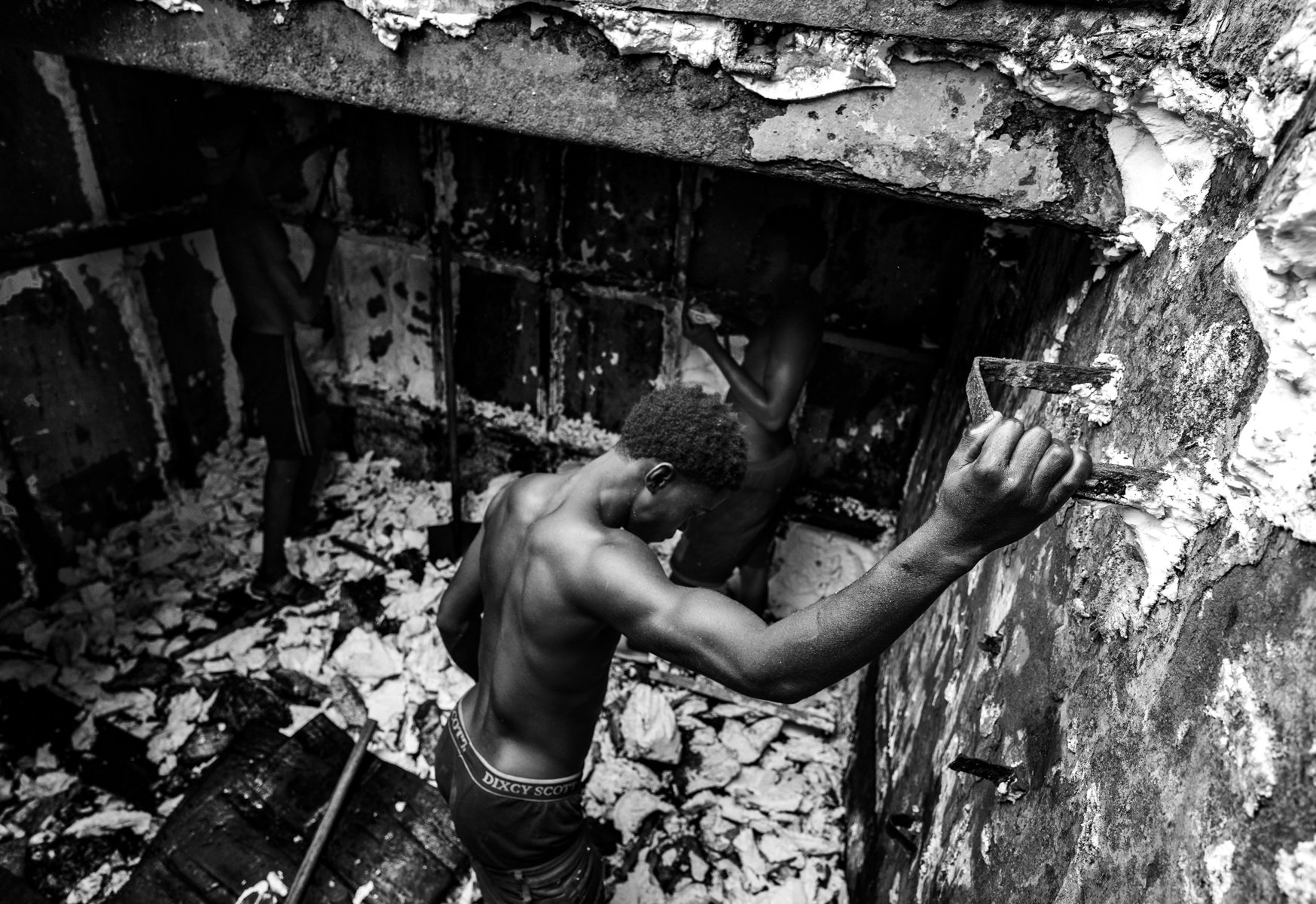 On a beach where two old boats lie stranded and slowly deteriorating in the sand, there exists Plato's Cave. Inside, a group of prisoners has an imperfect perception of reality because they have never known anything else. Every day, five young men work in the dark, damp holds of the ships. They use basic tools to tear out insulating foam and wooden planks so that the vessel can be dismantled with blowtorches. For two weeks, they are stuck in the bowels of these iron beasts, where the strong smell of naphtha mixes with the thick, suffocating heat. They receive a meagre $130 for their work, which they must share among themselves.